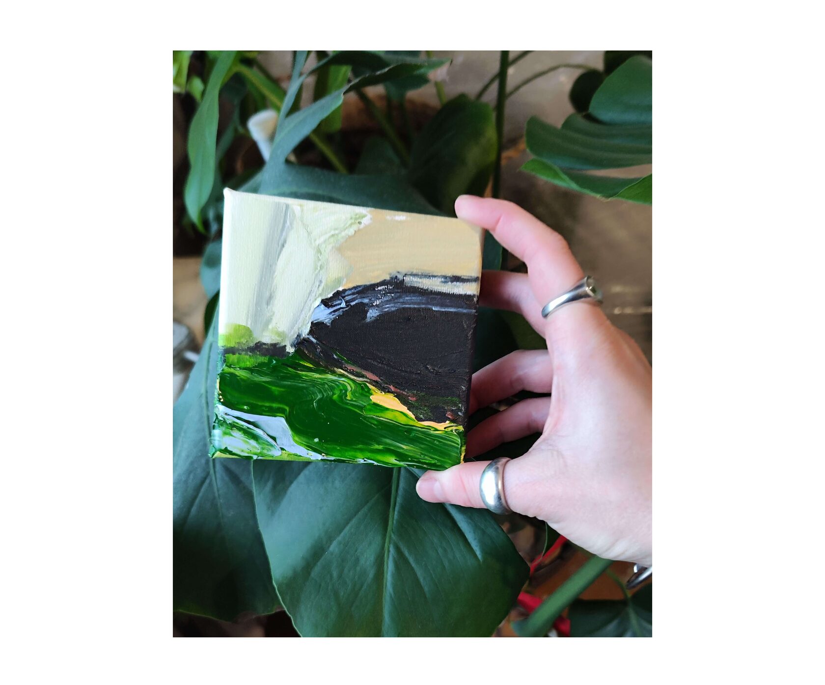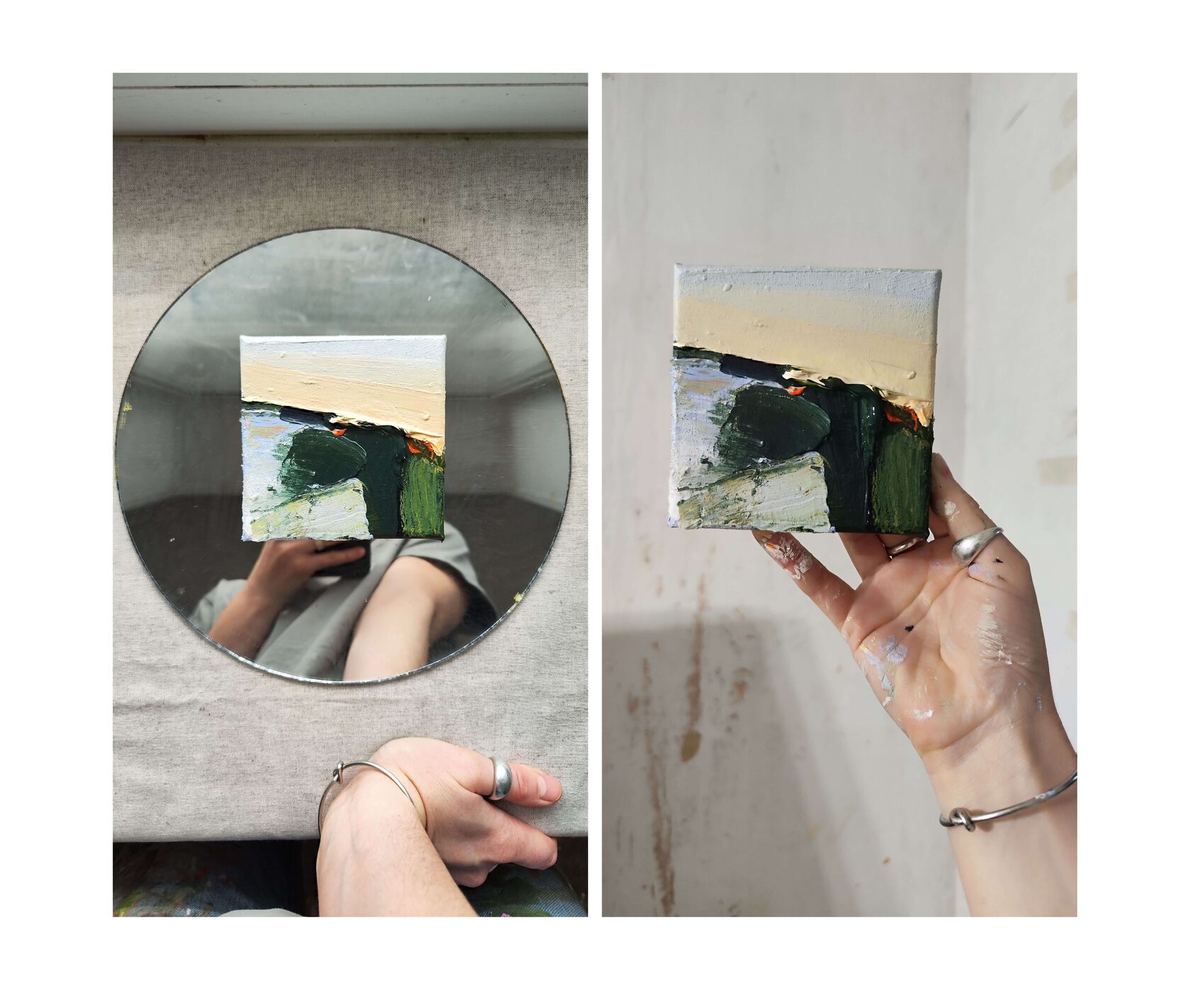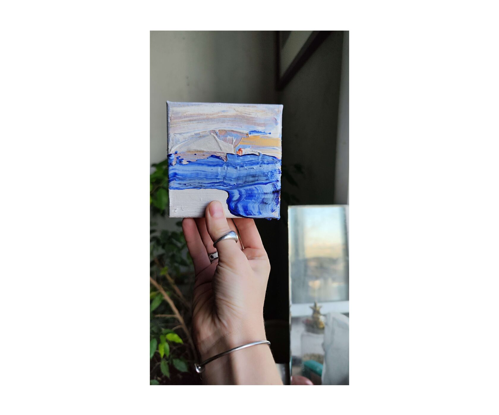 В маленьком полотне блики света и преломления, которые напоминают кристаллы драгоценного камня или отражения в озерах Урала из серии «Месторождения», 2025г