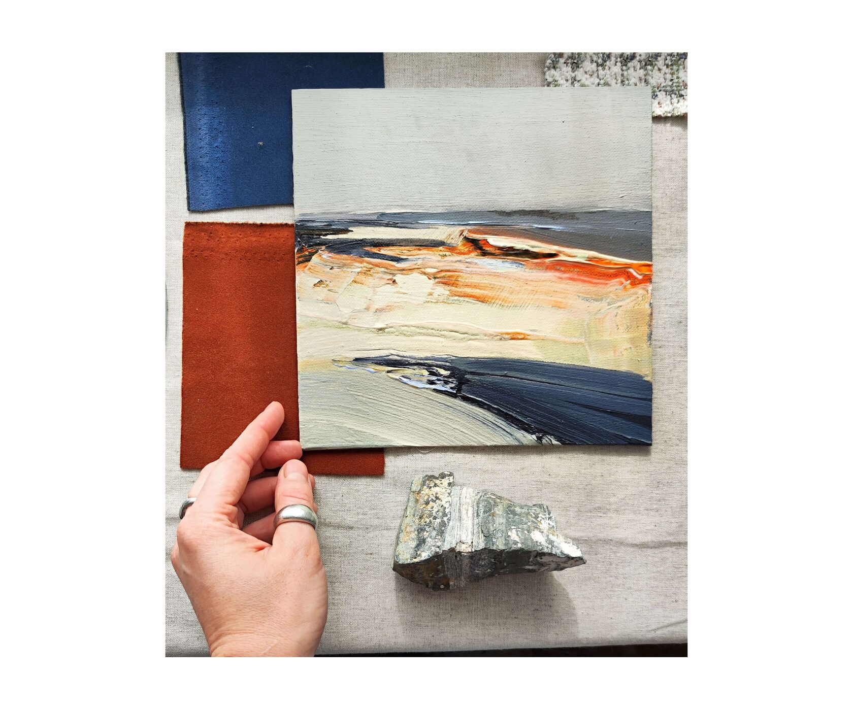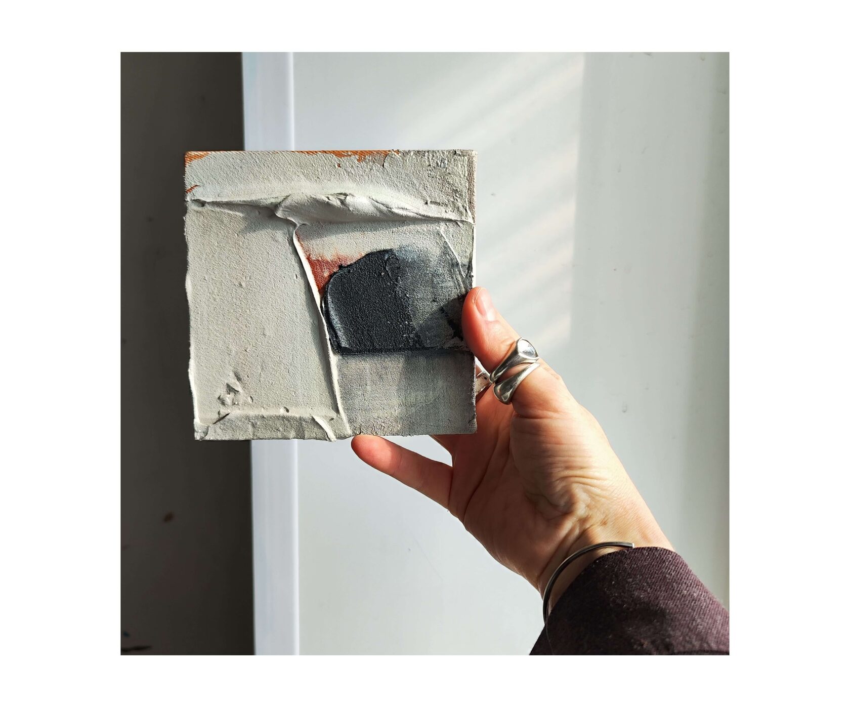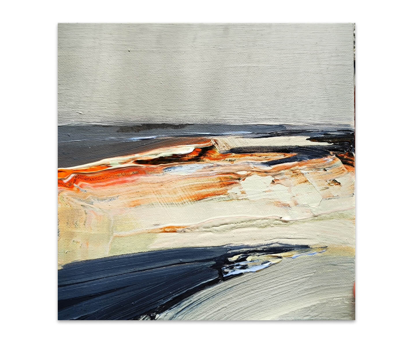 Терракот. Удивляюсь этому слову, в нем столько тепла и цвета. Картина навеяна находками старой керамики и черепками, отточенными морскими волнами. В этой работе цвет, соленые брызги и свет заката на побережье. из серии «Месторождения», 2025г