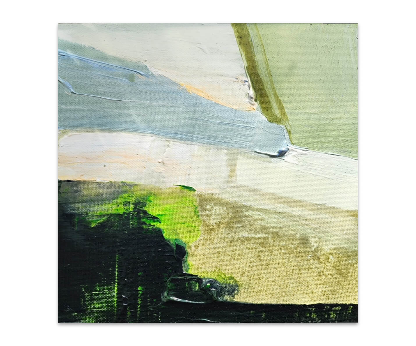 Картина цвета песка, цвета тени у барханов, раскаленного до белого неба. Здесь краска перетекает, скользит и наслаивается, но тонко и мимолетно, как будто ждет следующего порыва ветра, который снова перемешает слои и текстуры. из серии «Месторождения», 2024г