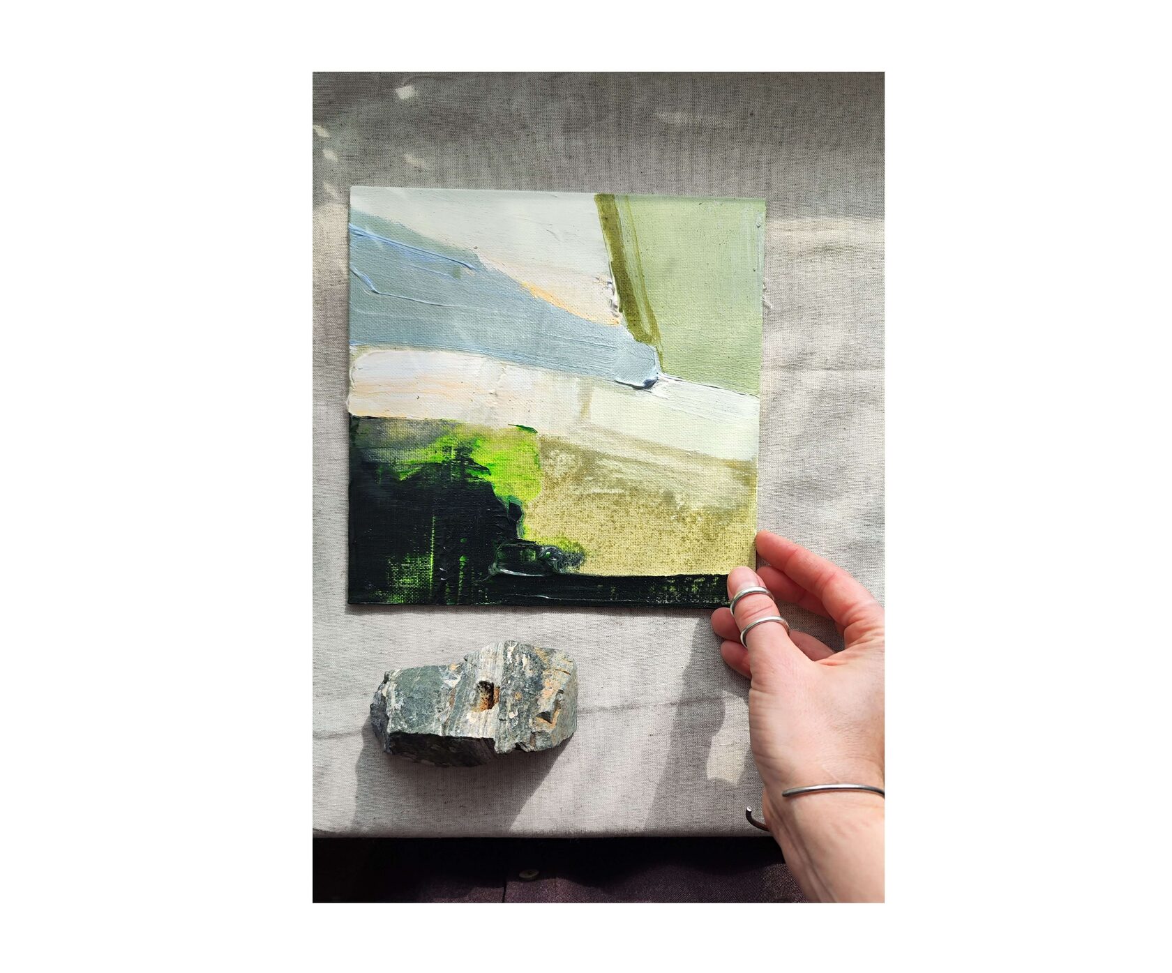 Каменный пояс. Так называют Урал. Цвета на этом холсте напоминают его. Эта картина о каменных реках, лесах с подстилкой из мха, о запахе уральского можжевельника. из серии «Месторождения», 2024г